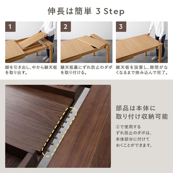 使わない継天板はテーブル下に収納できます。サッと取り出せて設置できるのは嬉しいポイント。