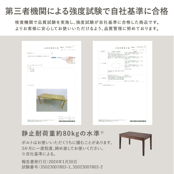 検査機関で品質試験を実施し、強度試験が自社基準に合格した商品です。